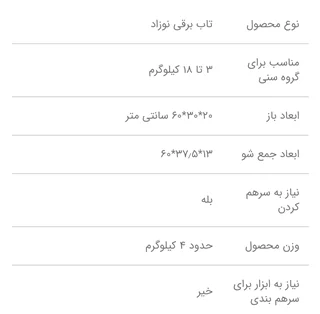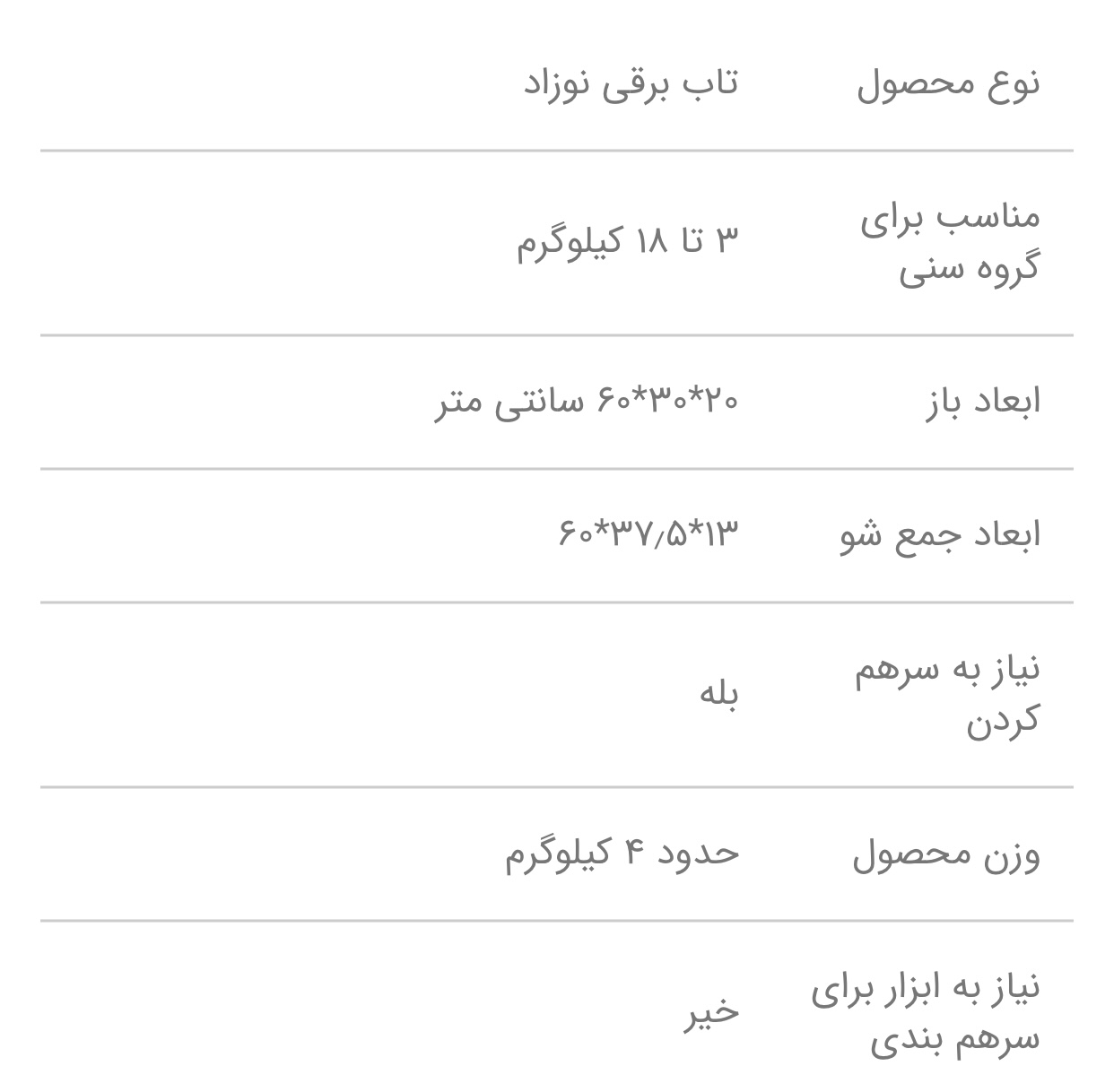 تقابل استفاده برای کودک از بدو تولد تا یک سالگی به عنوان گهواره برقی مناسب برای کودکان ۳ تا ملهگی تا ۱۸ کیلوگرم دارای وزن ۴ کیلوگرم موزیکال با ۱۵ ملودی آرام بخش قابلیت تنظیم صدادارای نشیمن نرم و راحت برای کودک پشتی یا تکیه قابل تنظیم دارای تایمر حرکتی در سه حالت ۱۵, ۳۰ و ۴۵ دقیقه ای قابلیت تنظیم سرعت تاب در ۵ حالت قابلیت کنترل از راه دور توسط ریموت قابلیت وصل شدن به بلوتوث یا فلاش و پحش موسقی دلخواه دارای آویز عروسکی با قابلیت جدا شدن دارای کمربند ایمنی ۵ نقطه ای دارای پشه بنددارای حفاظ جانبی و غلت گیرکارکرد با اتصال به برق (آداپتور موبایل) و باتری