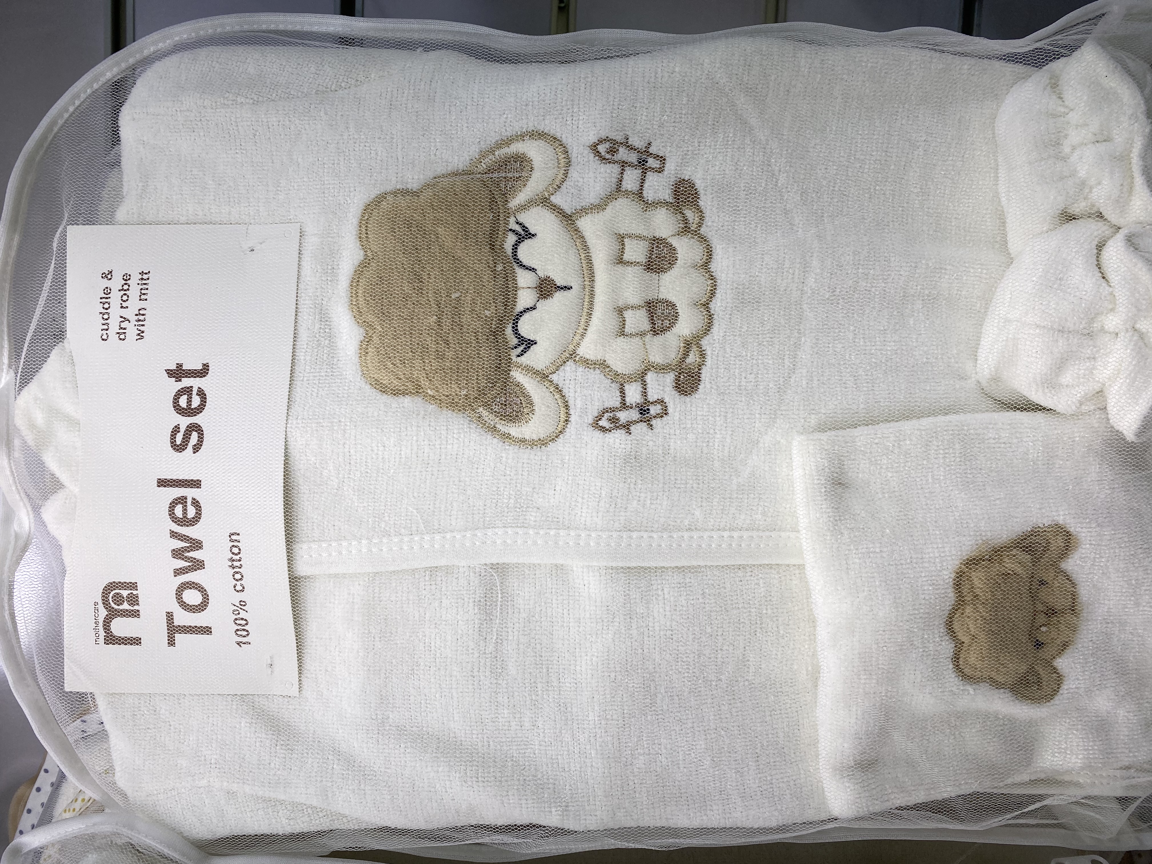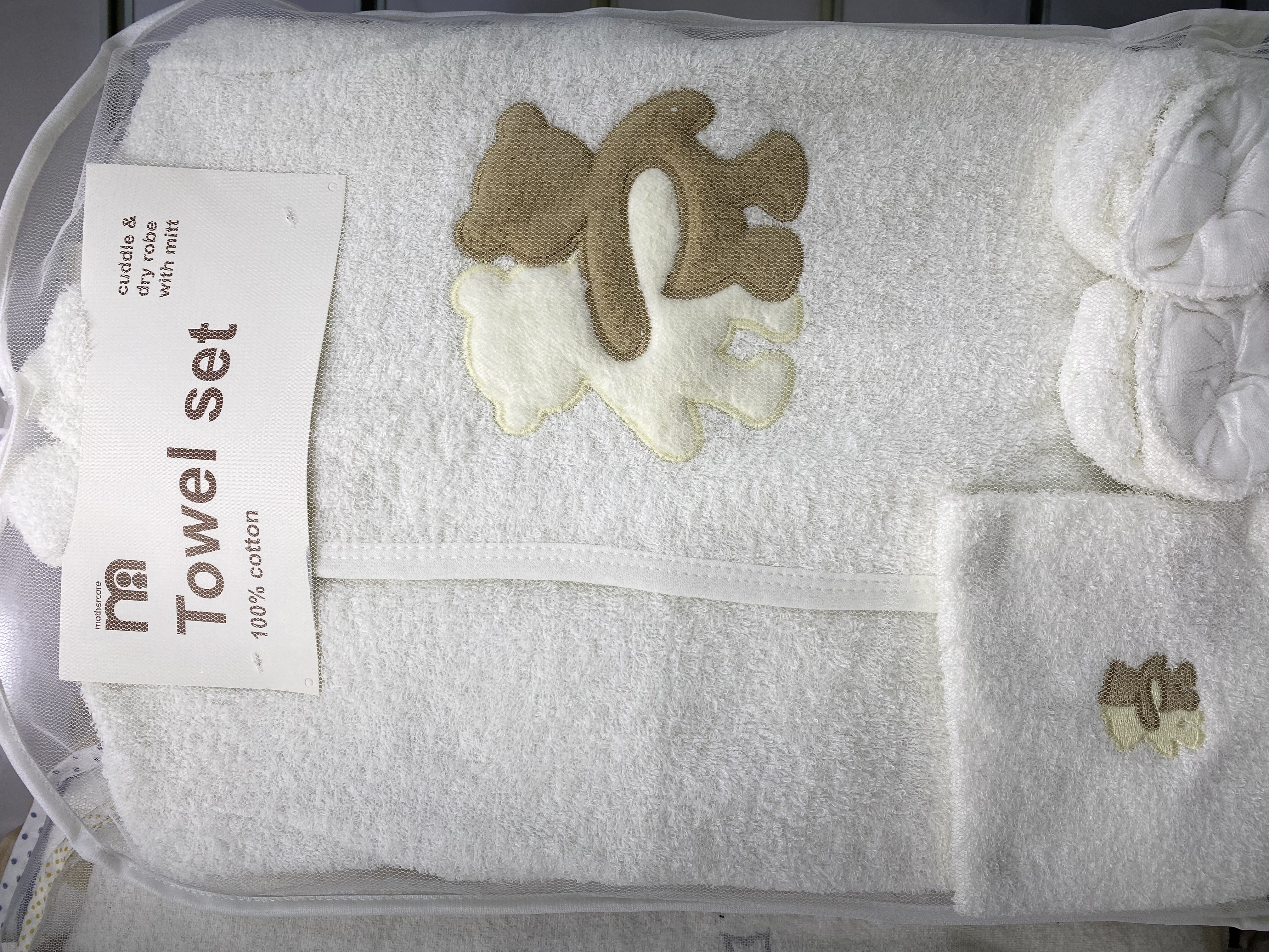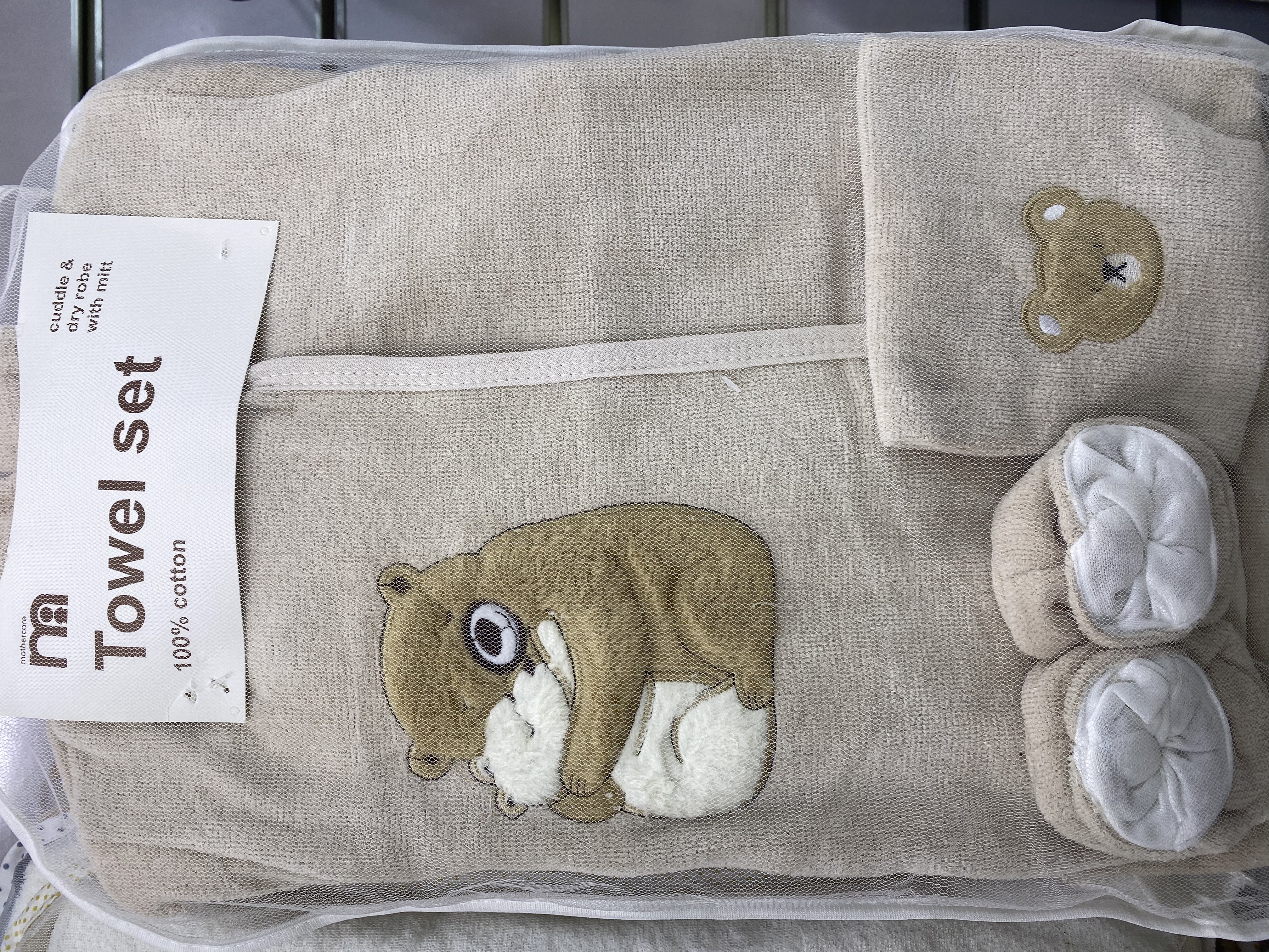 حوله٨٥*٨٥ كلاه دار+ليف+ حوله صورت* پاپوش+ تن پوش تا ٣ سال