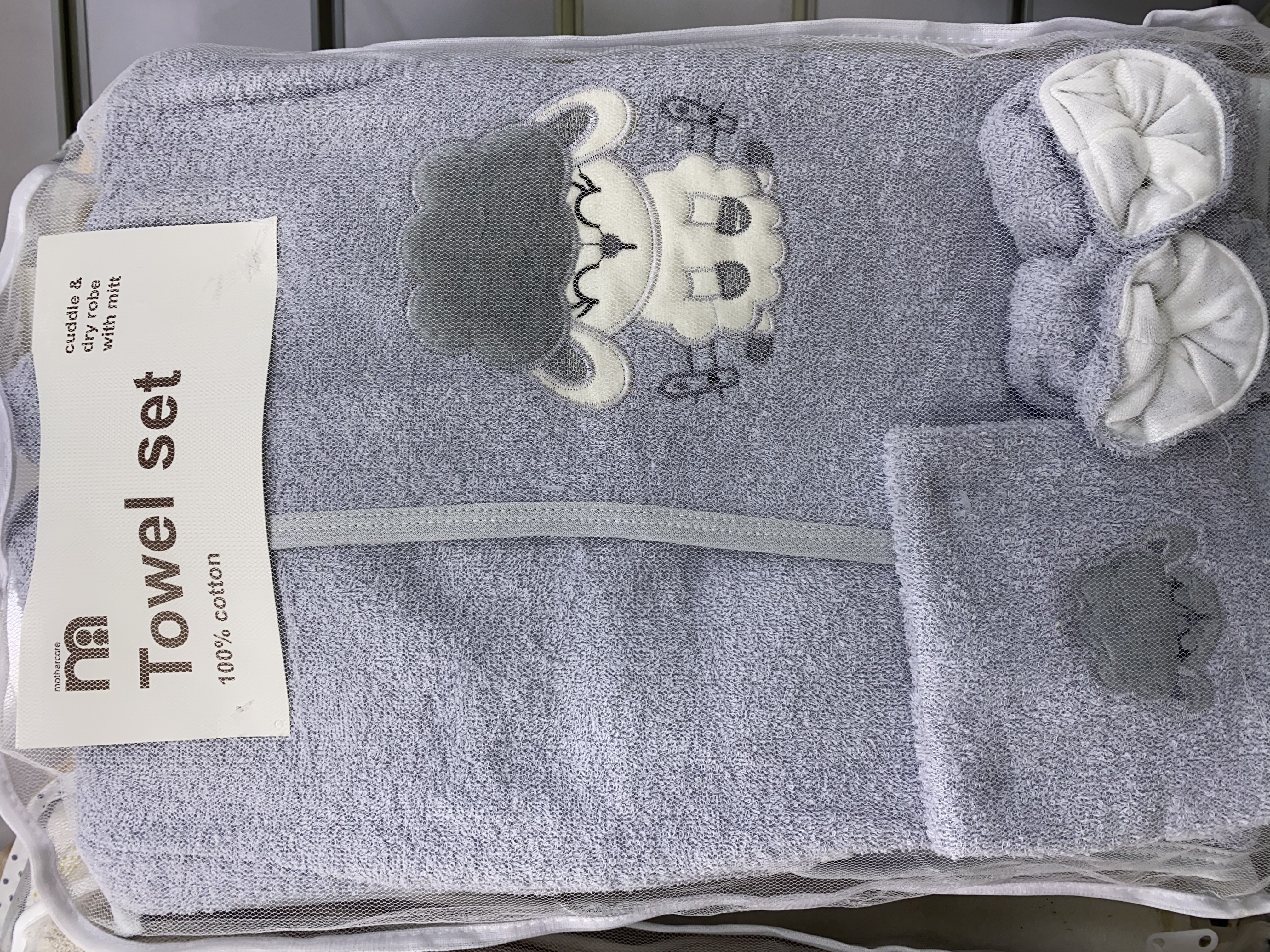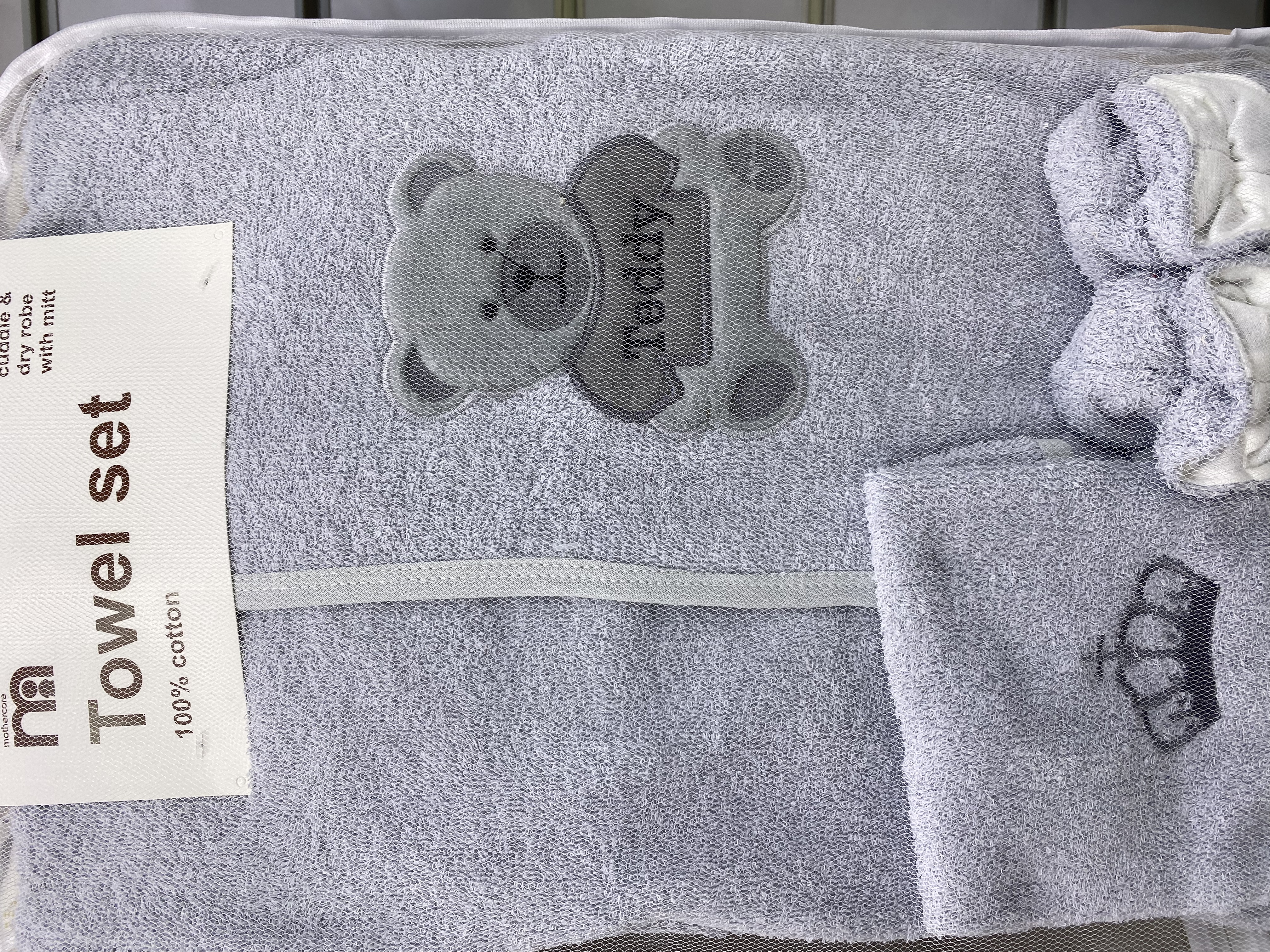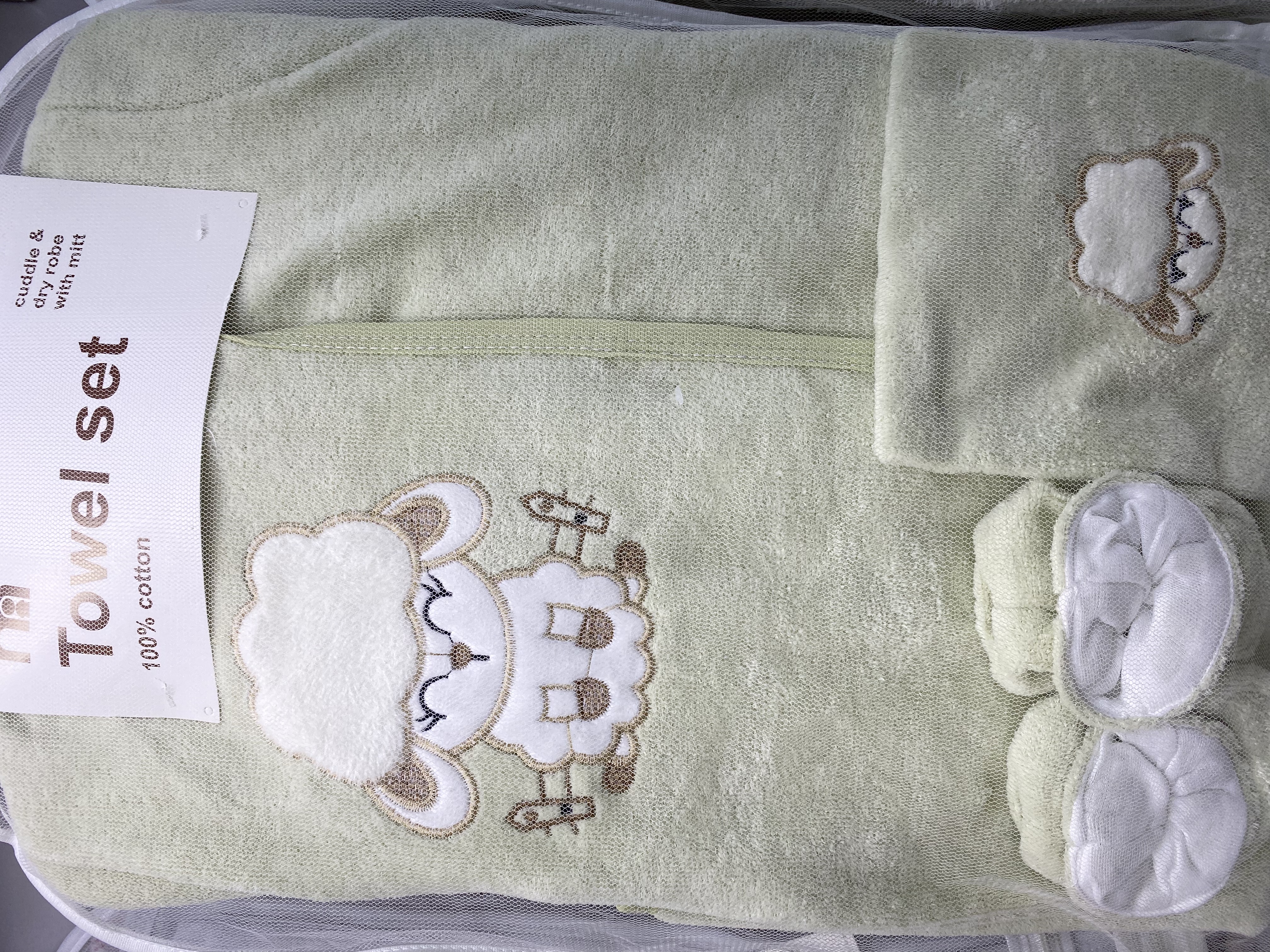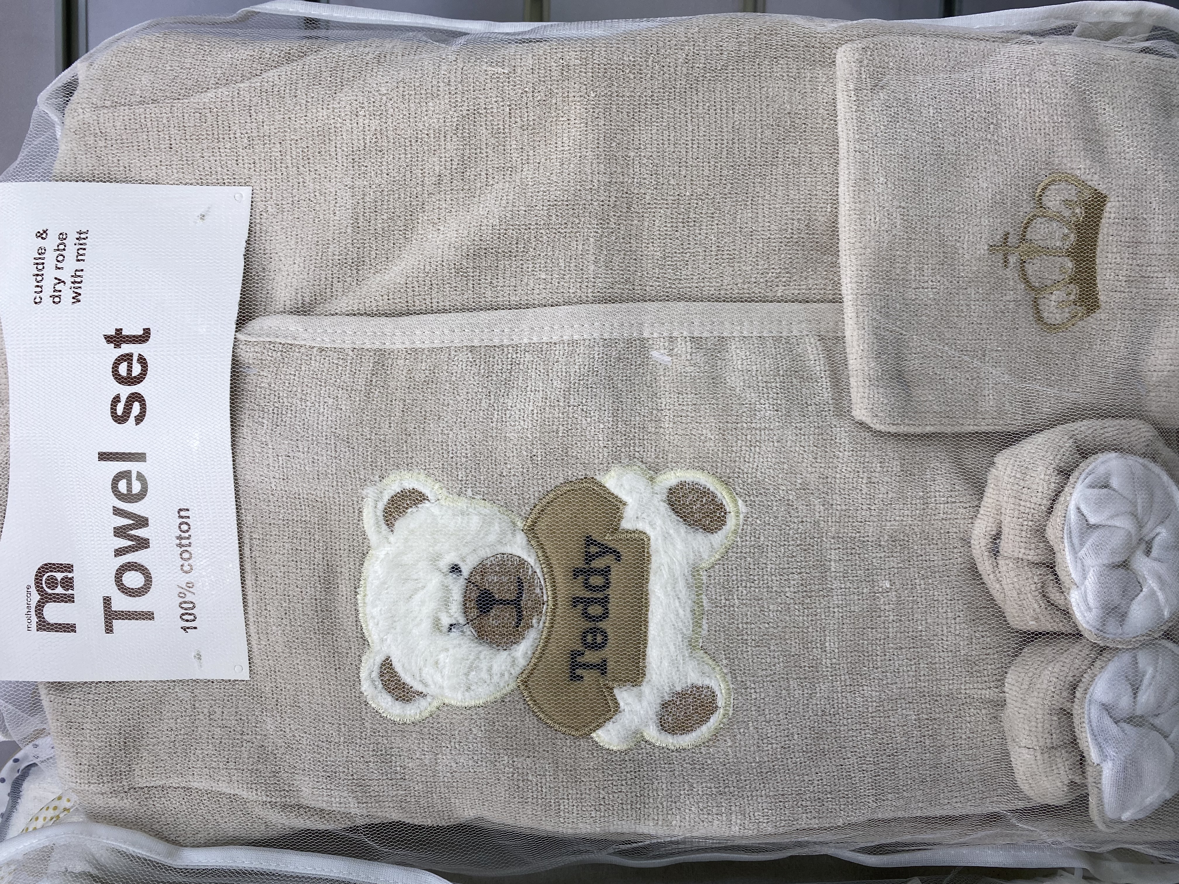 حوله٨٥*٨٥ كلاه دار+ليف+ حوله صورت* پاپوش+ تن پوش تا ٣ سال